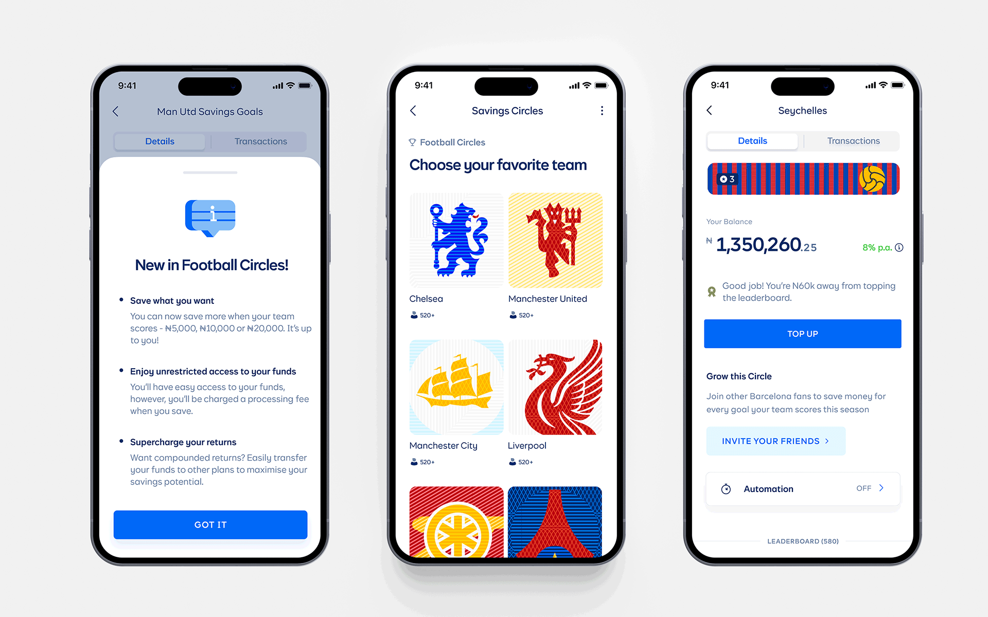 As the project lead and primary designer, I spearheaded the redesign of our sub-product, Circles, transforming it into an engaging, sports-driven investment product while strategically phasing out underperforming savings groups. I provided art direction and created illustrated brand assets to enhance the product experience. In collaboration with our engineering team, I ensured the seamless development of the product. Additionally, by working closely with our product managers, I played a pivotal role in executing a successful launch. For the brand design, I revitalized the club emblems, integrating our money patterns to align with our cohesive visual system. Furthermore, I designed assets for key elements of the app, including the team selection screen, summary screen, and details page, enhancing the overall user experience.